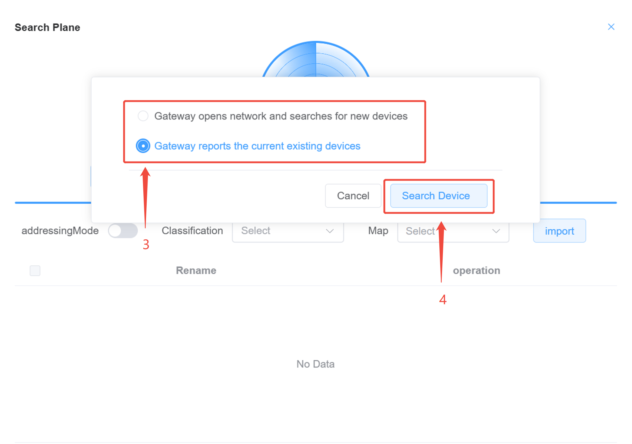 If new devices need to be added after the installation phase, select "Gateway opens network and searches for new devices." If no new devices need to be added, select "Gateway reports the current existing devices."