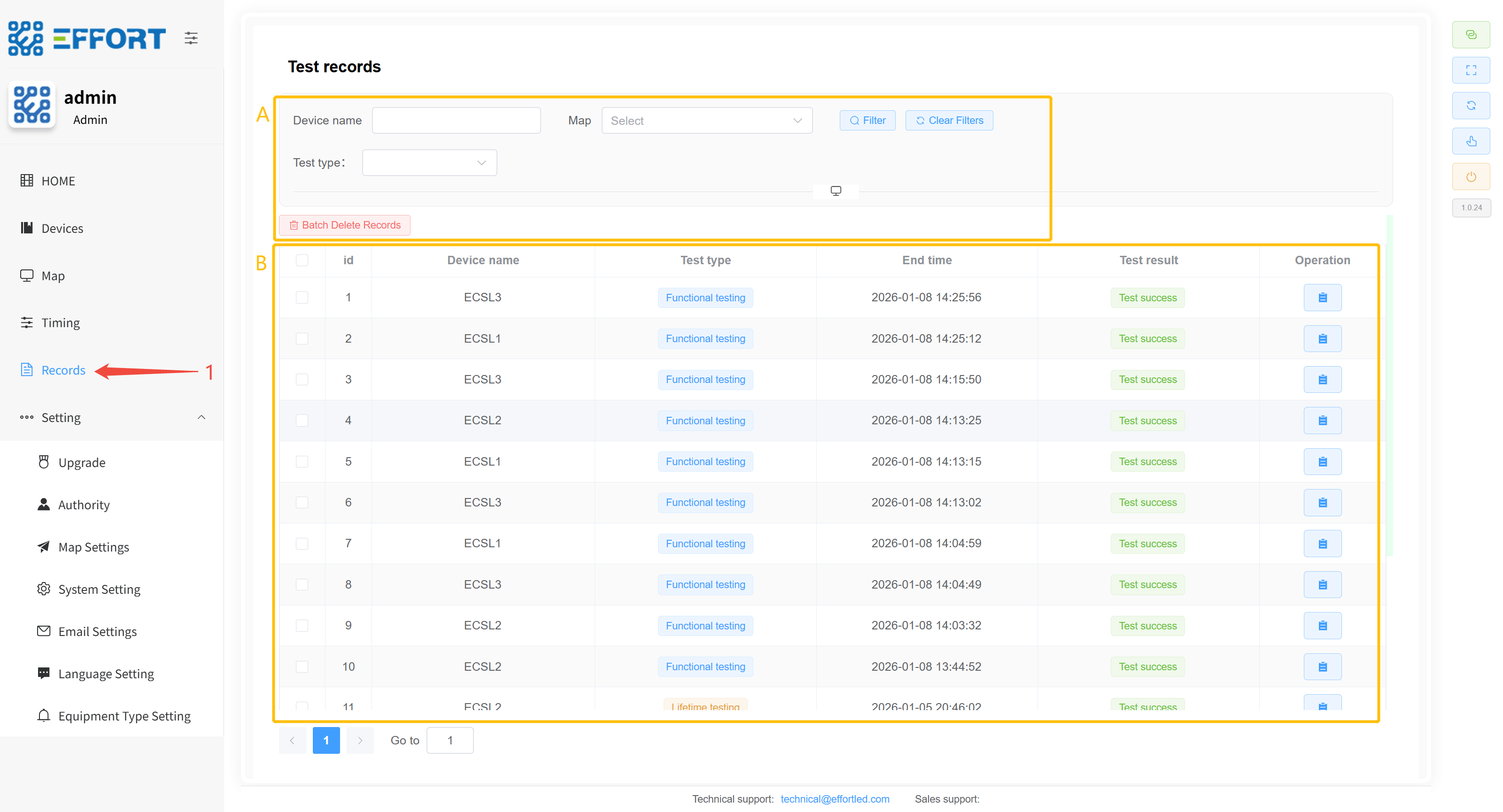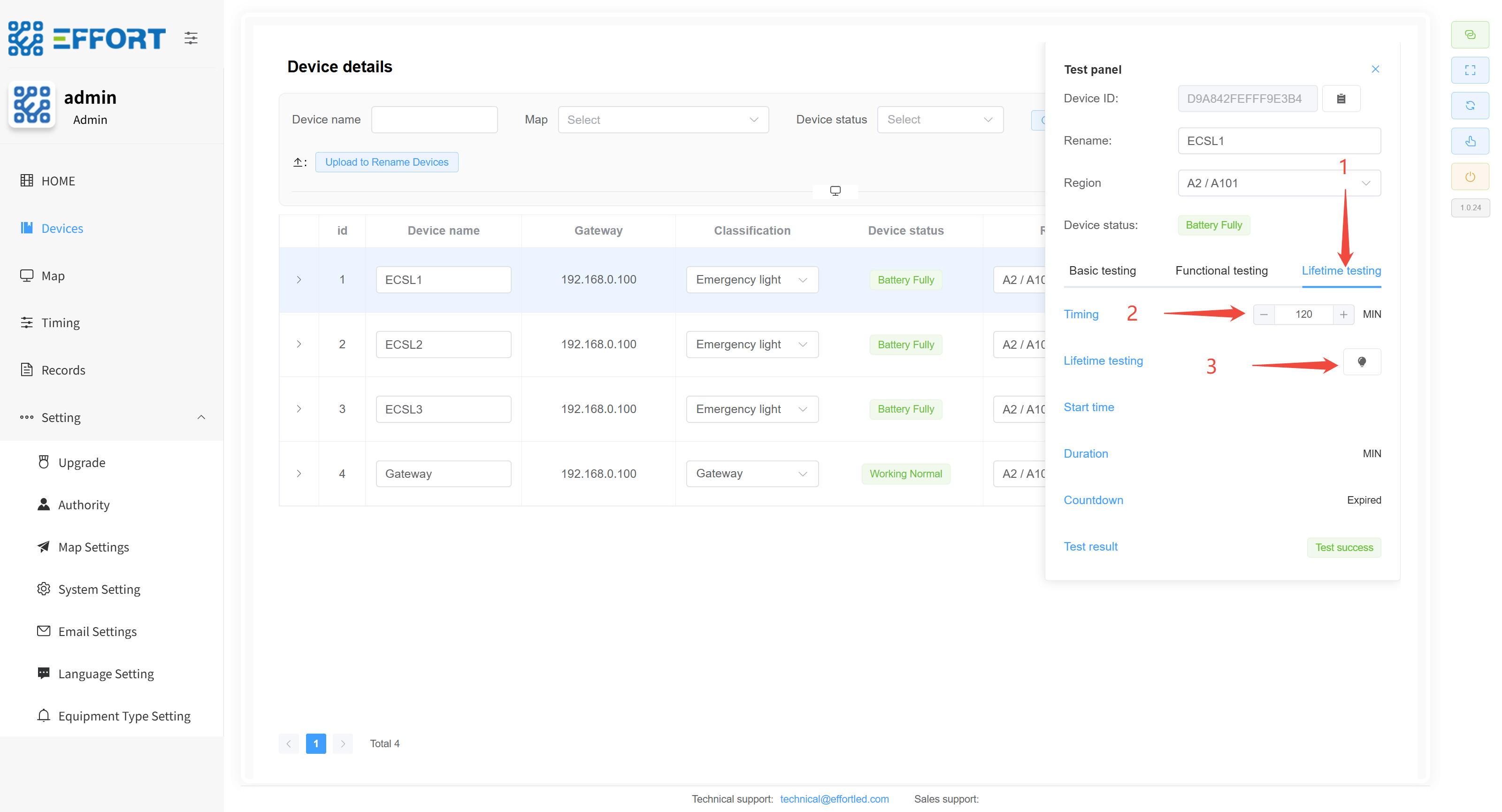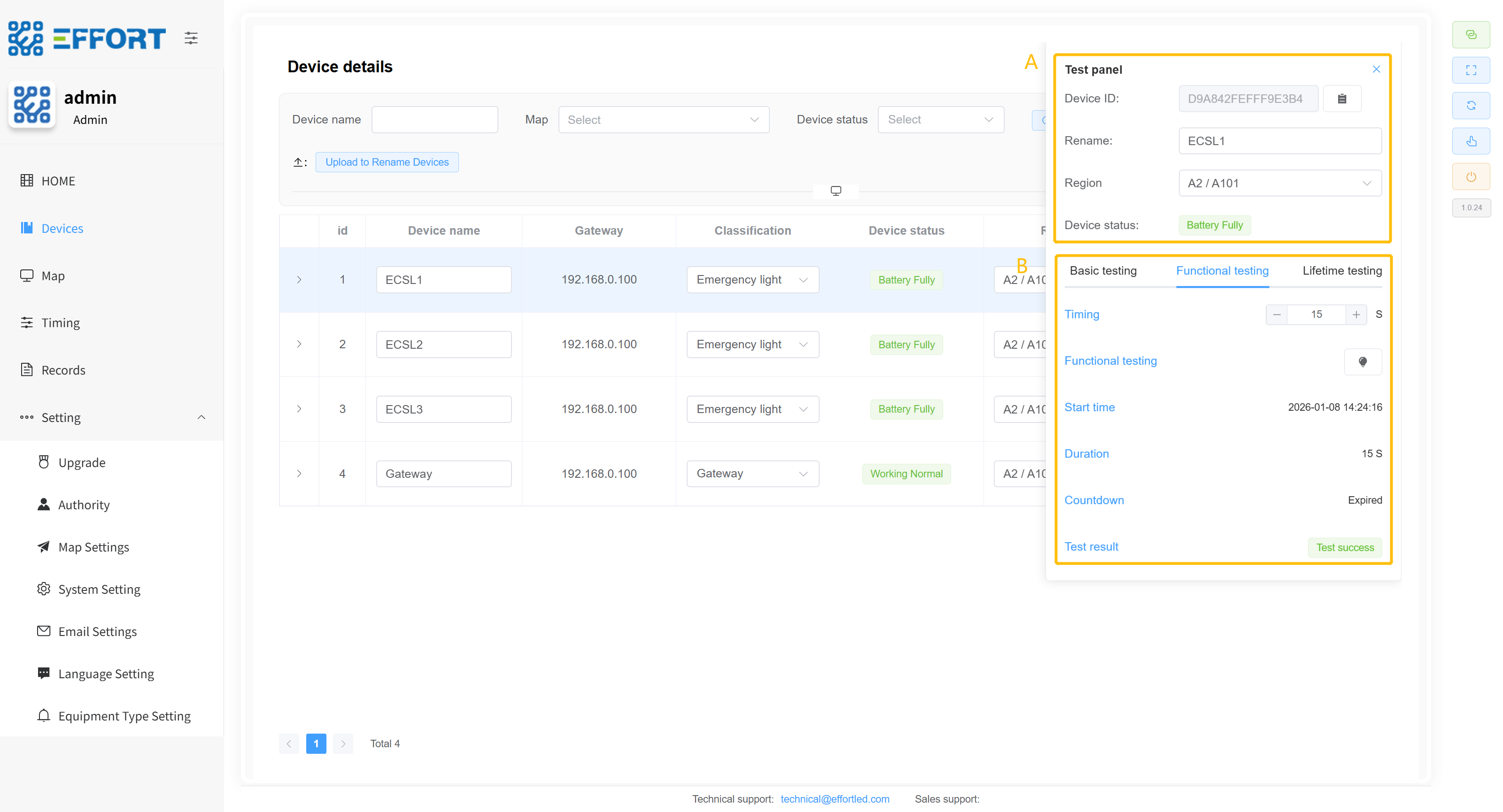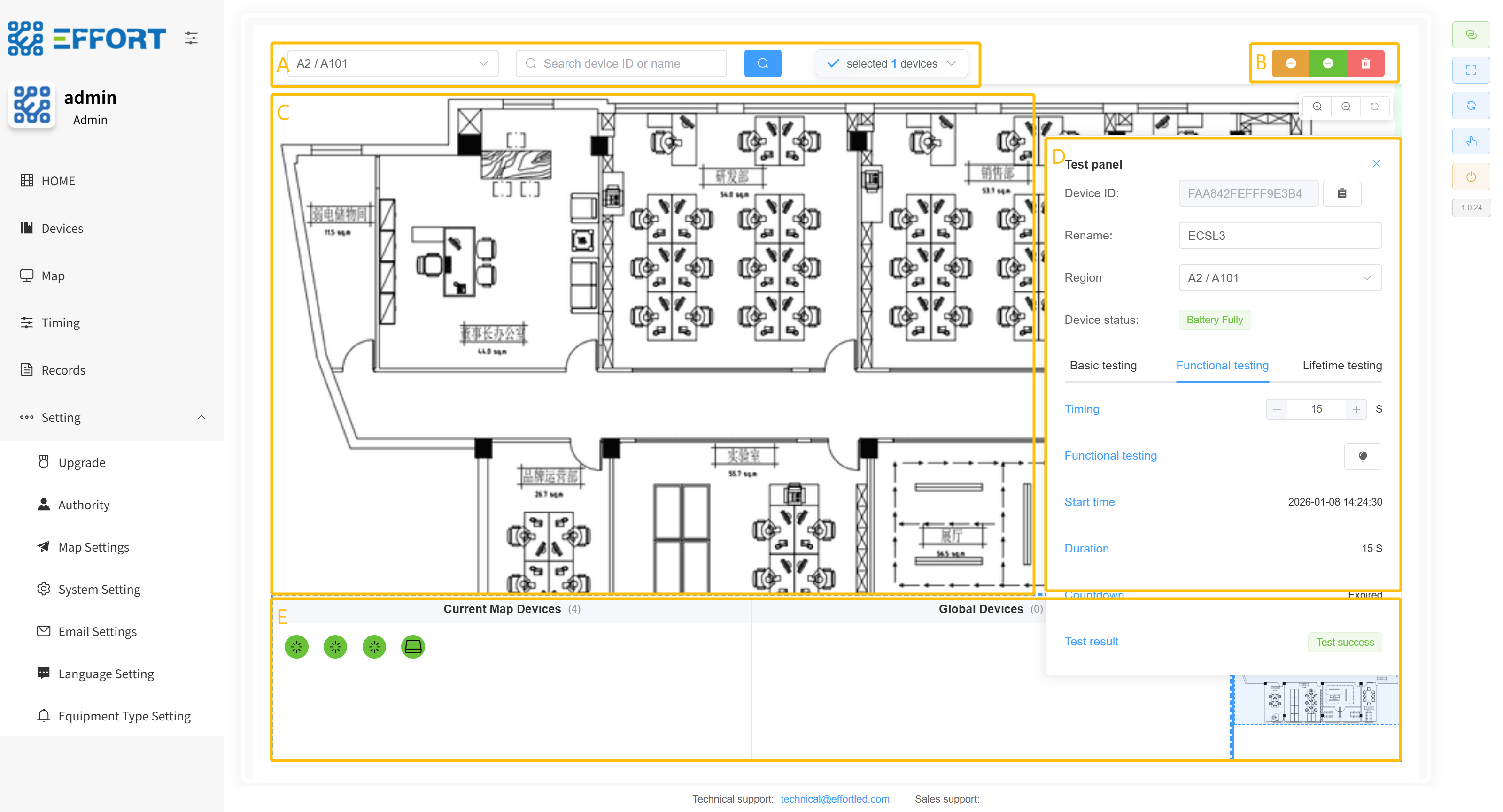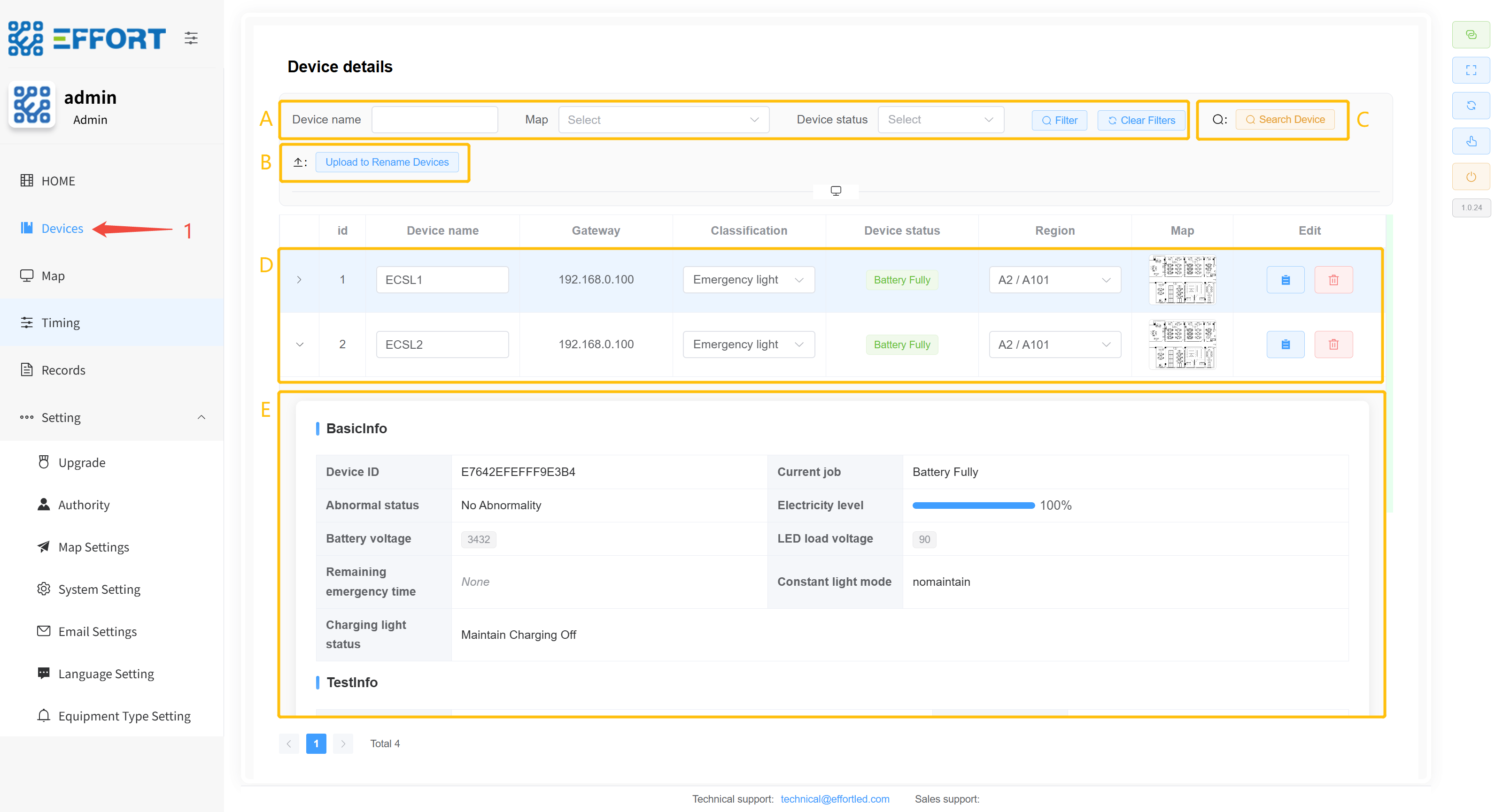 - 方框 E:设备详细信息:设备 ID、电量、电池电压、剩余应急时间、LED 负载电压、最后一次功能检结果、功能检次数、最后一次寿命检结果、寿命检次数、距离上次寿命检时间、上次寿命检持续时间、maintain 模式、充电灯状态