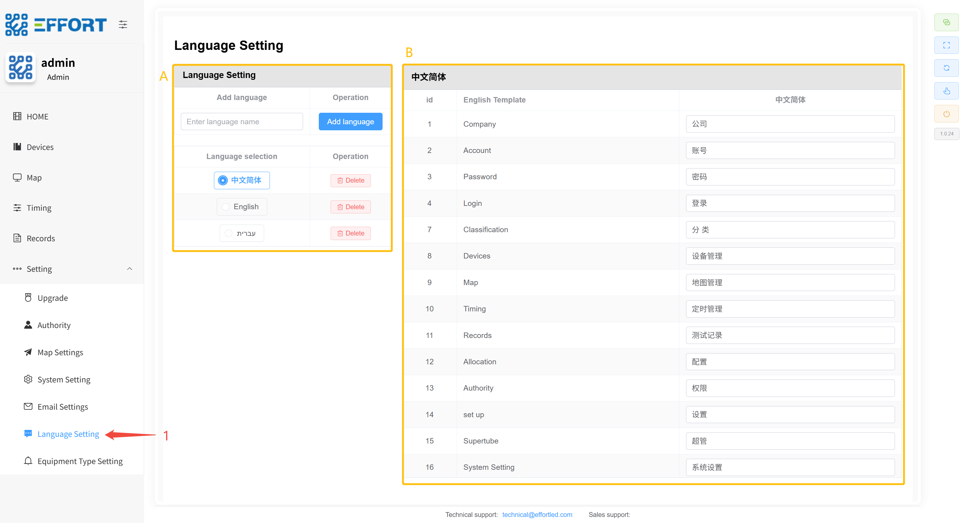 - 方框 A:语言管理的操作栏:语言新增按钮、语言选择、语言删除