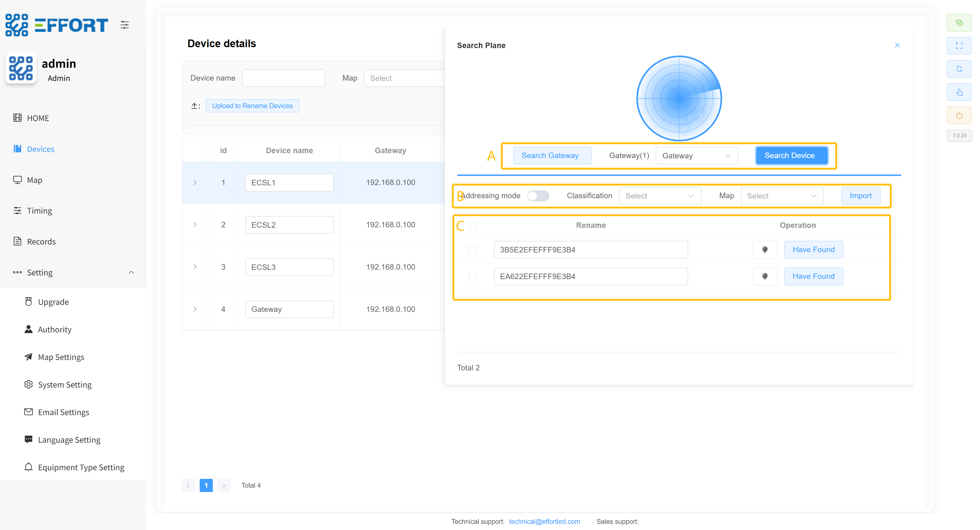 - 方框 D:设备基础信息:序号、设备名、网关、分类、状态、区域
