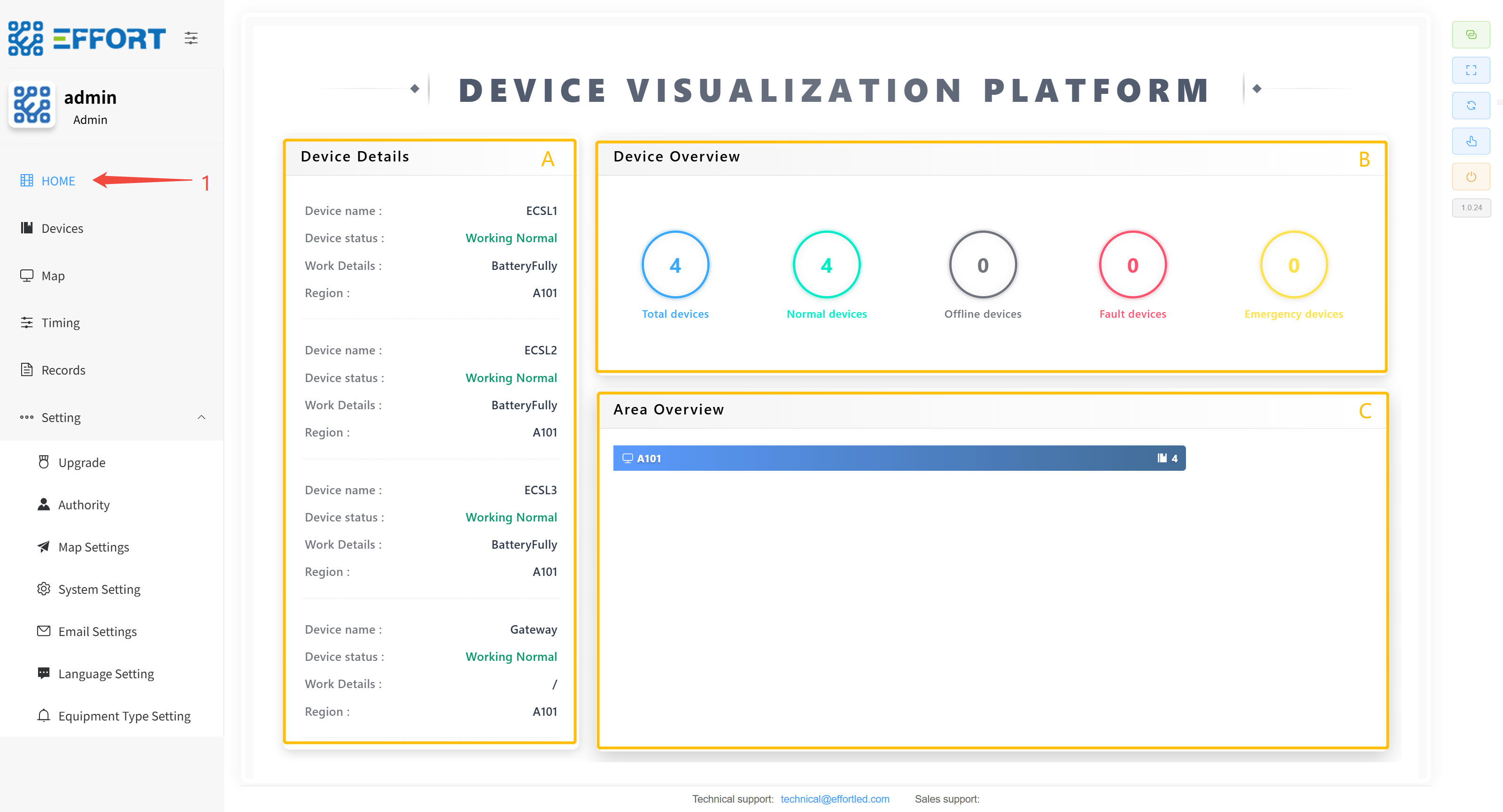 方框 A:设备基本信息:设备 ID、重命名、区域、设备状态