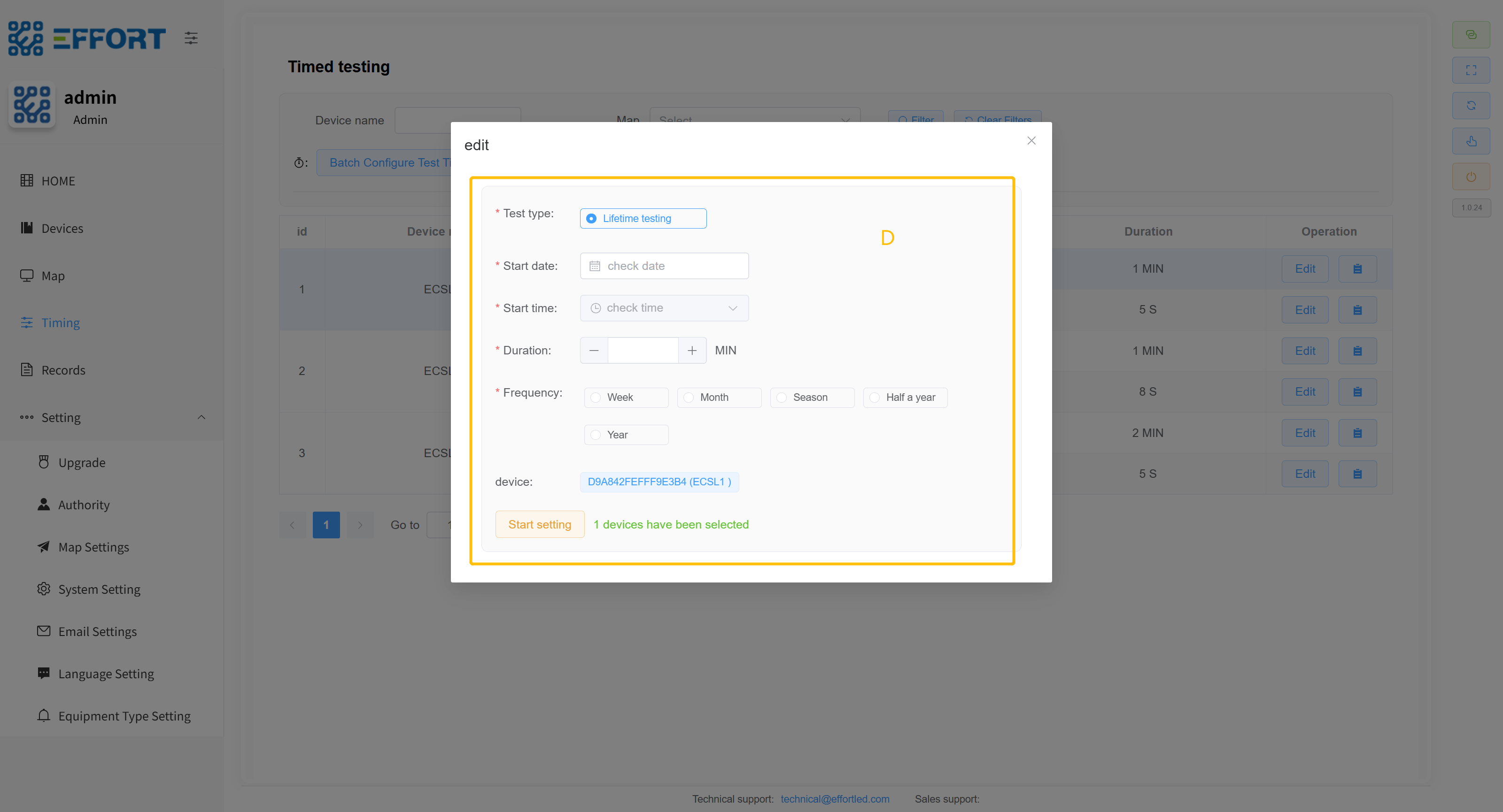 - Lifetime testing:定时时间、测试按钮、开始时间、持续时间、倒计时、测试结果