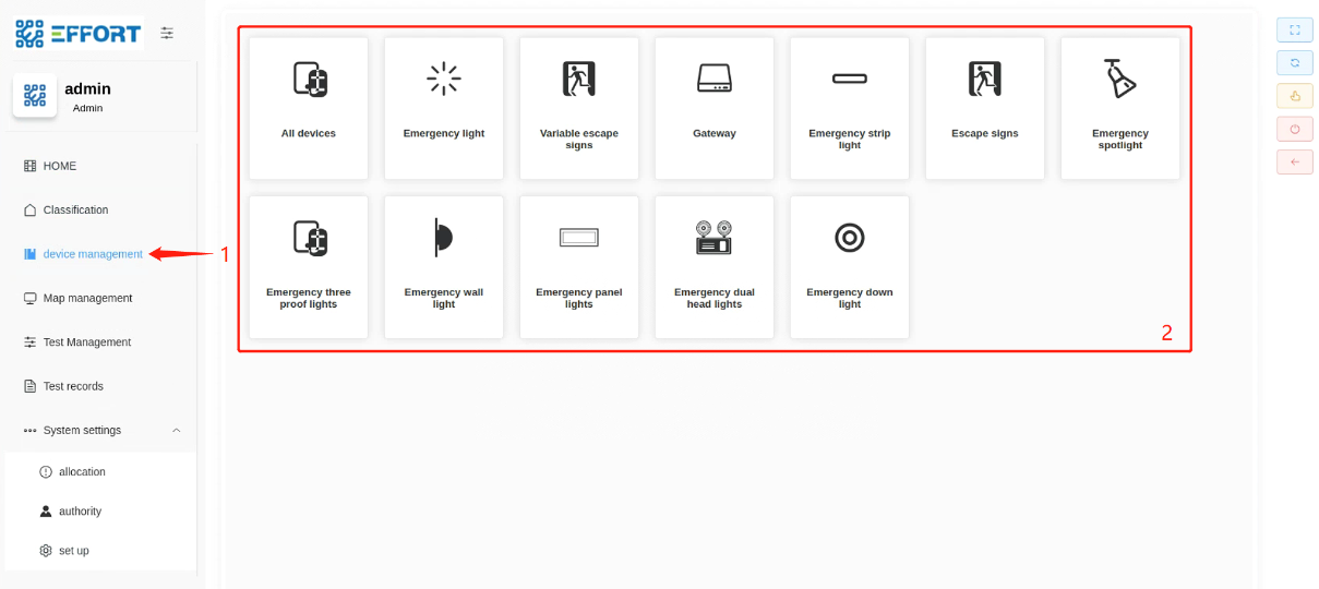 其他例如 Emergency light 为对应类型设备的管理子页面,用户可自定义设置 ALL Device 下设备的类型,这样就可以在对应类型子页面下看到所属类型的设备。