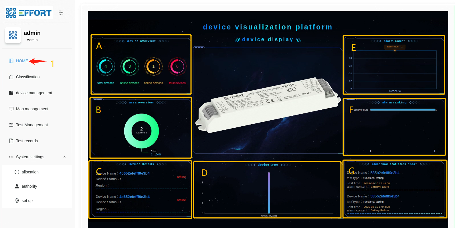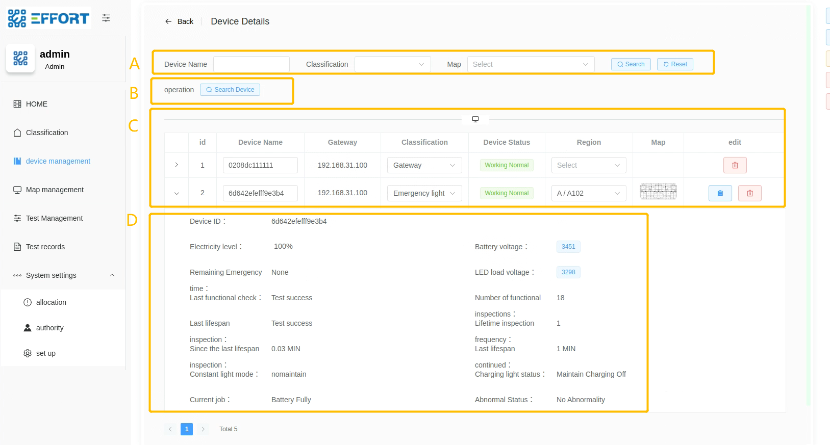 - 方框 D:设备详细信息:设备 ID、电量、电池电压、剩余应急时间、LED 负载电压、最后一次功能检结果、功能检次数、最后一次寿命检结果、寿命检次数、距离上次寿命检时间、上次寿命检持续时间、maintain 模式、充电灯状态