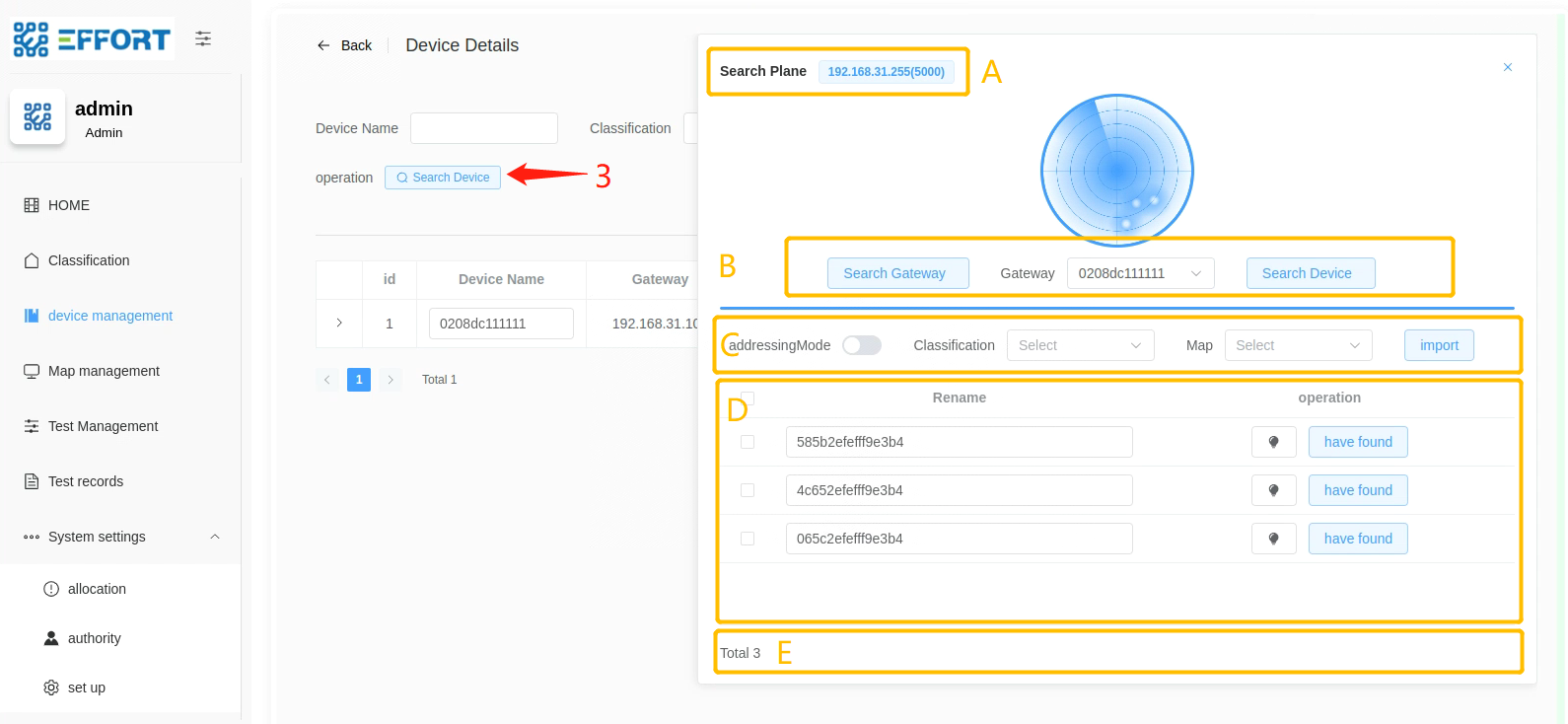 - 方框 E:搜索到的设备数量