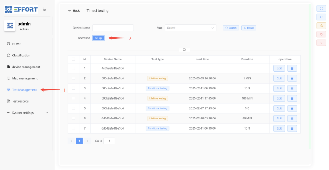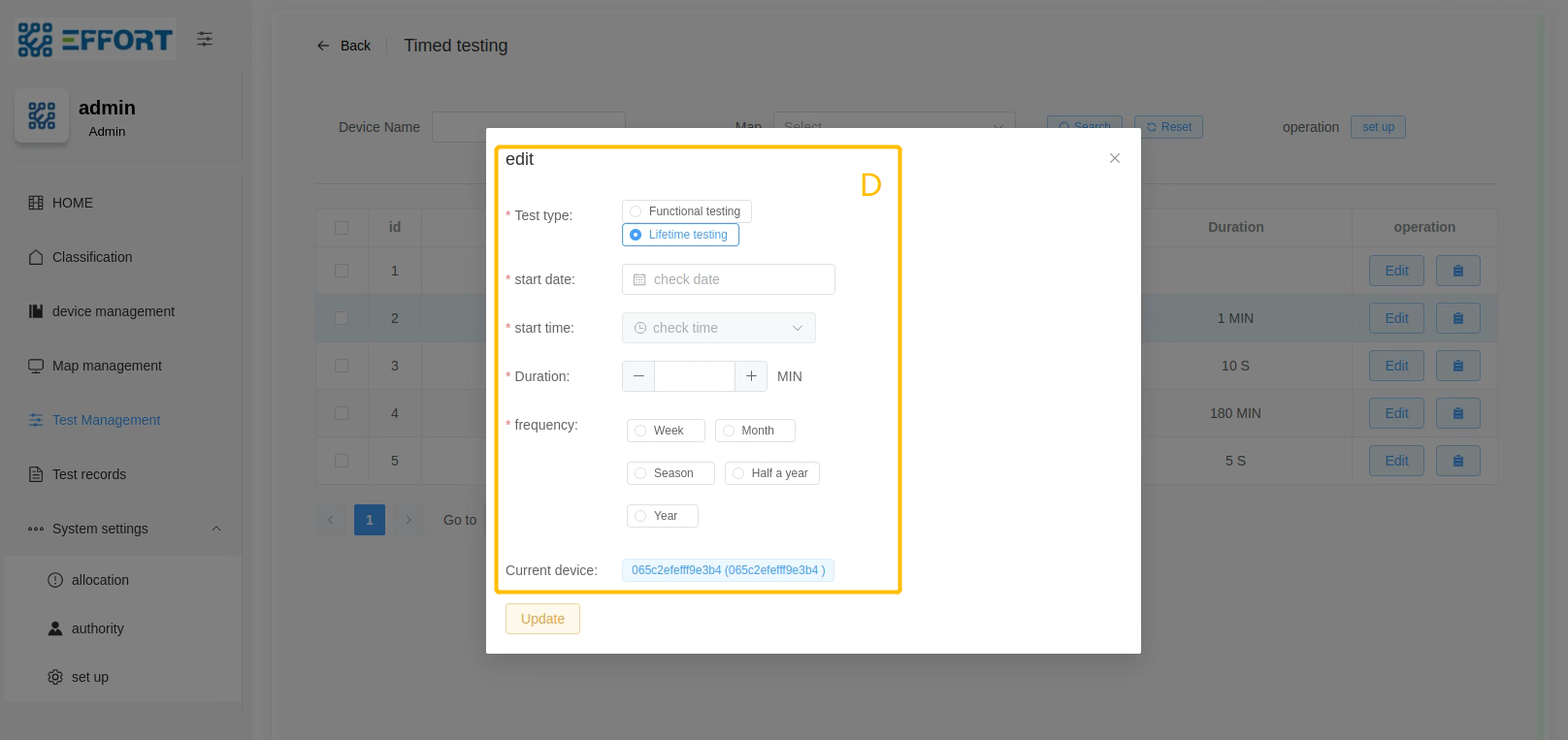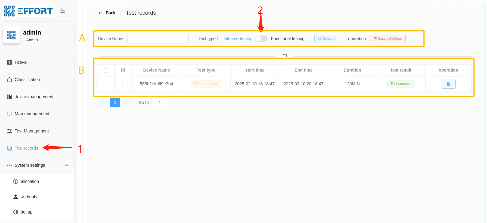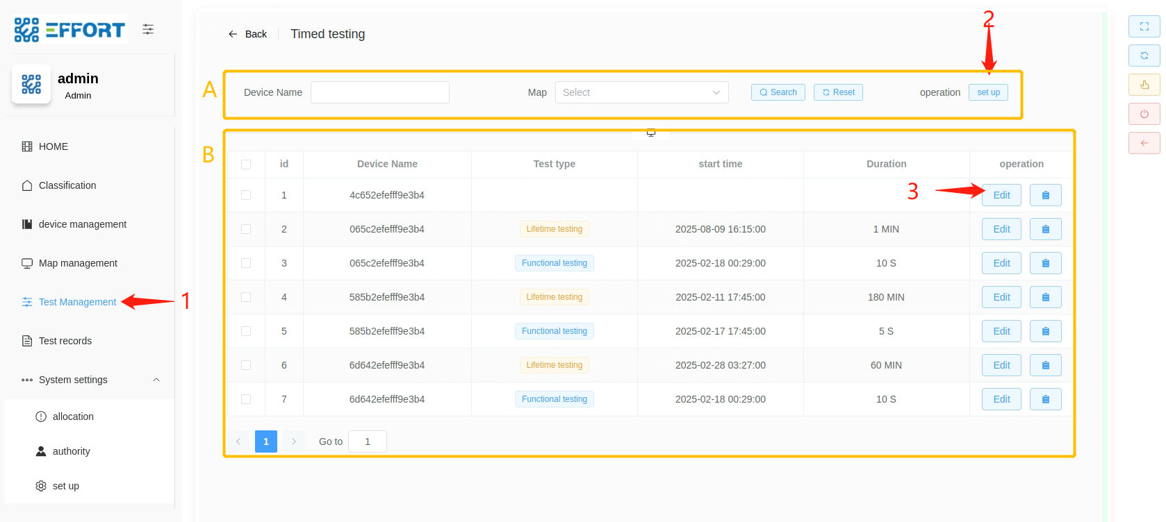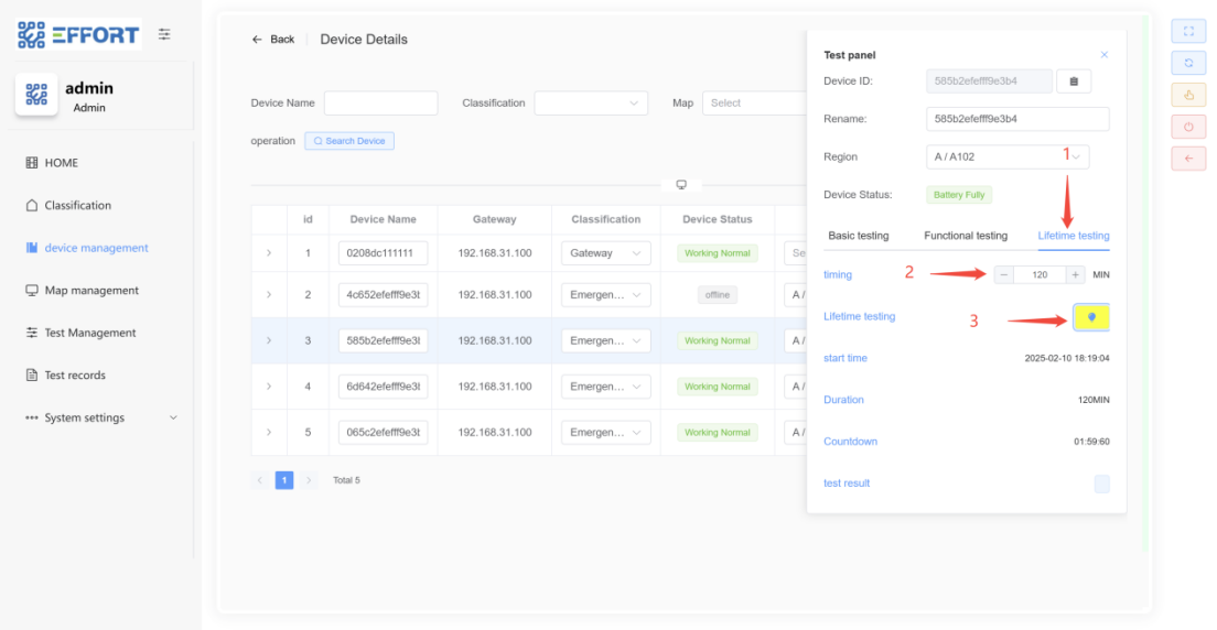 - Lifetime testing:定时时间、测试按钮、开始时间、持续时间、倒计时、测试结果
