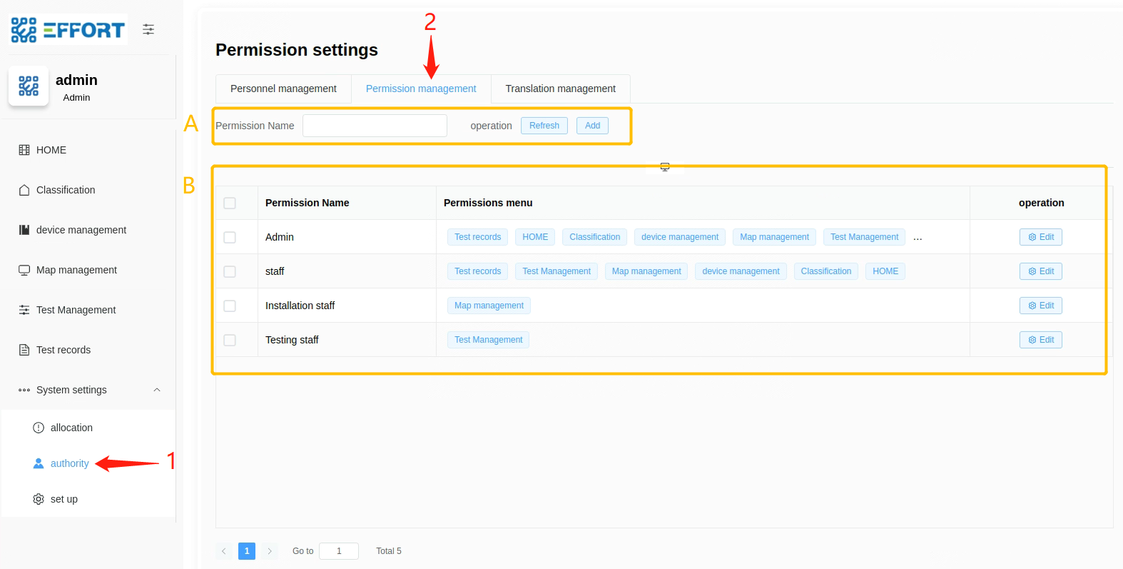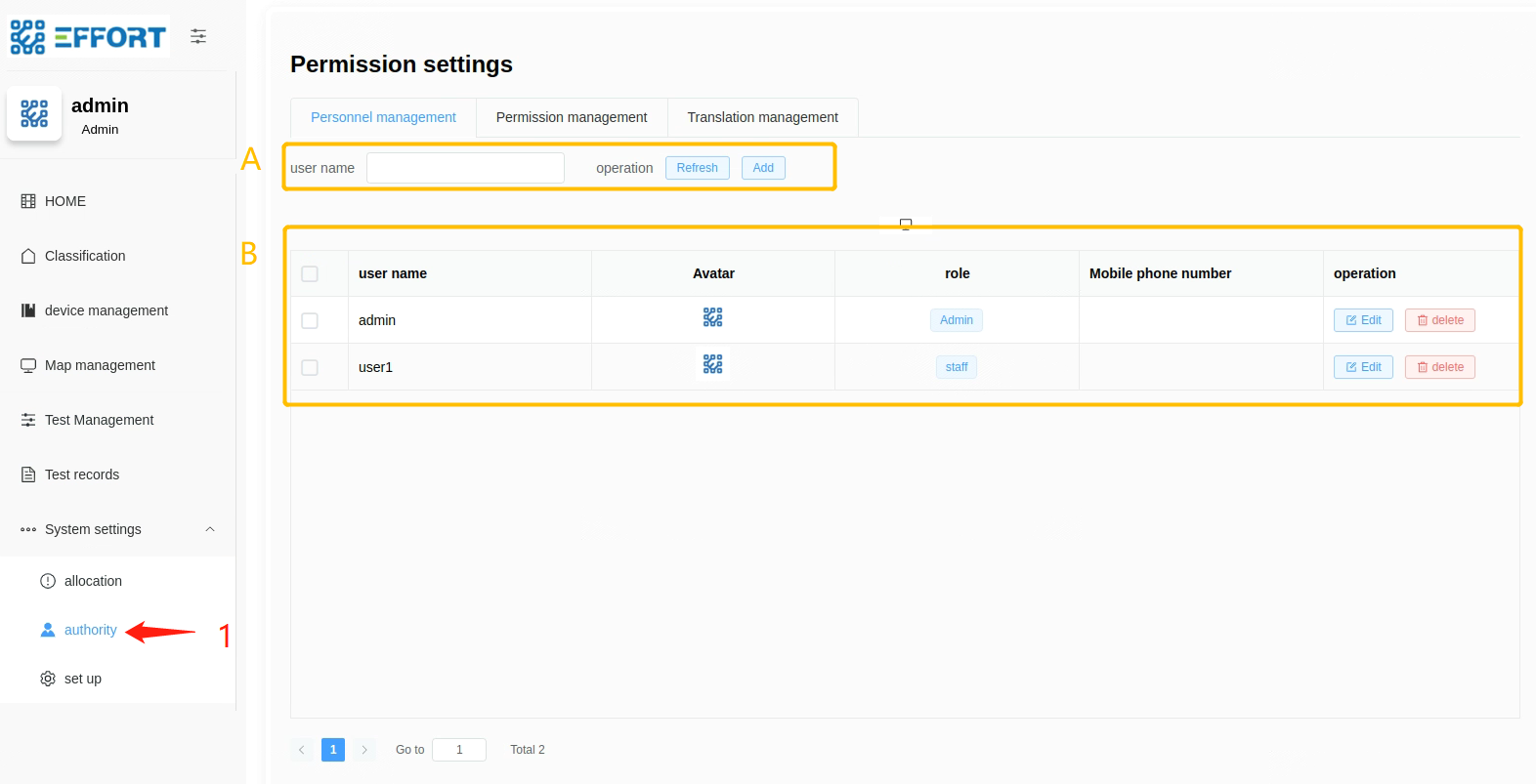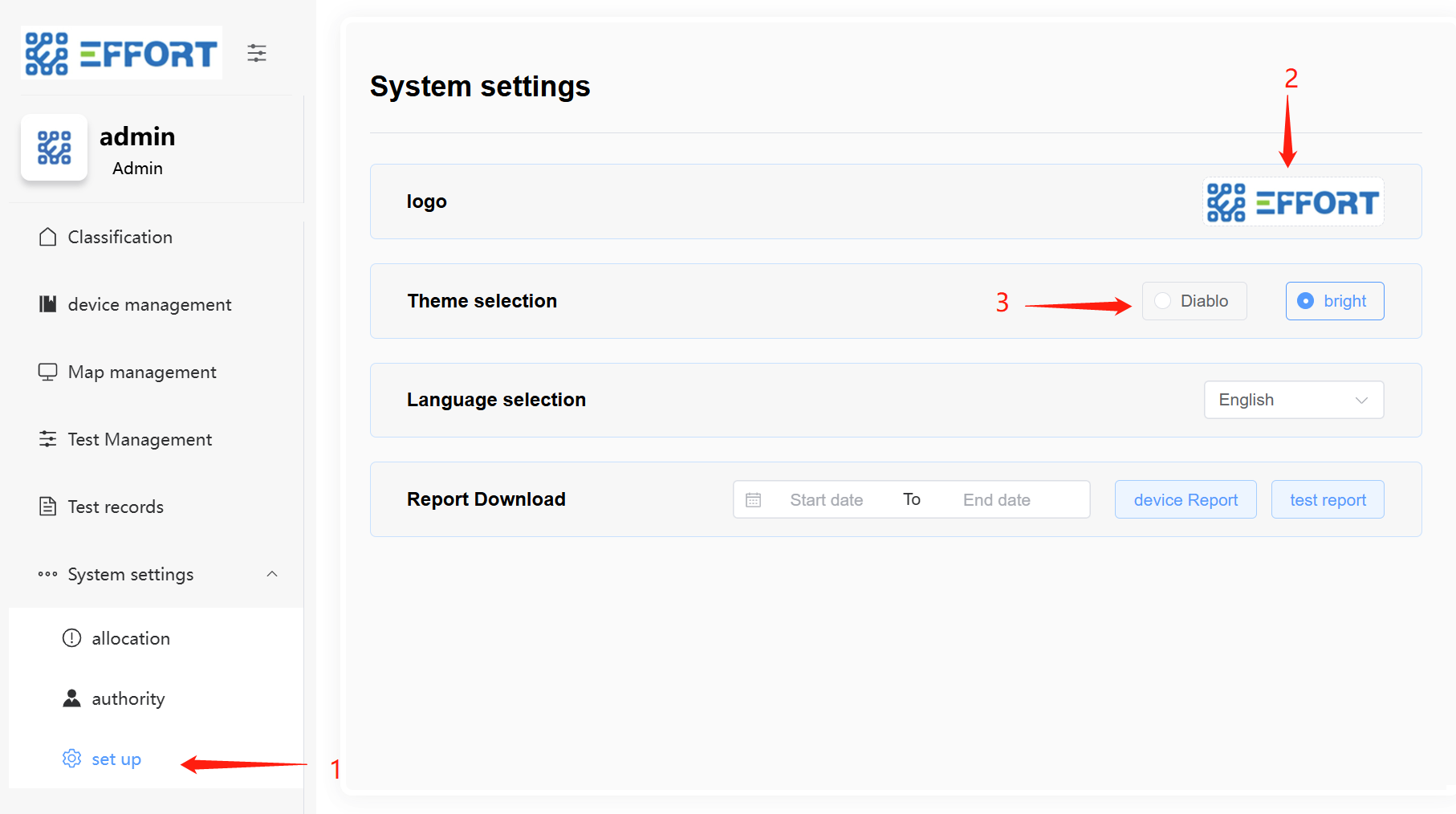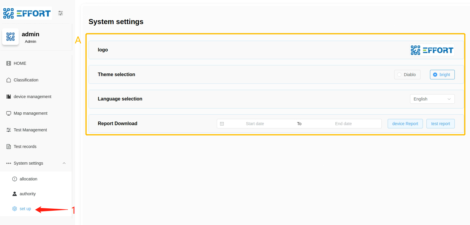 - 方框 A:设置页面包含配置 LOGO、语言、主题、下载测试记录报告等功能