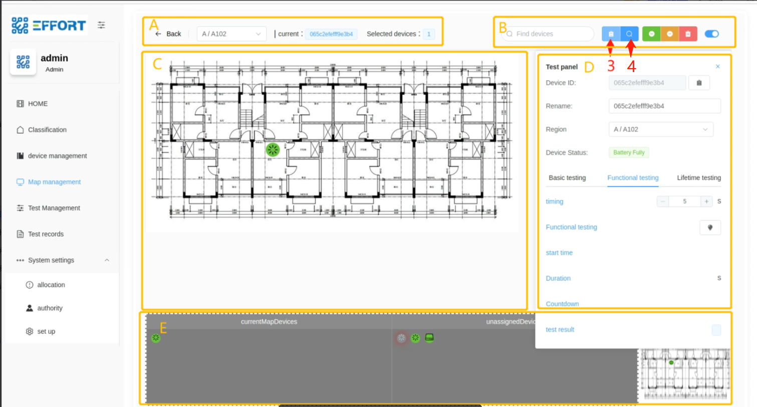 - 方框 E:设备详细信息:设备 ID、电量、电池电压、剩余应急时间、LED 负载电压、最后一次功能检结果、功能检次数、最后一次寿命检结果、寿命检次数、距离上次寿命检时间、上次寿命检持续时间、maintain 模式、充电灯状态