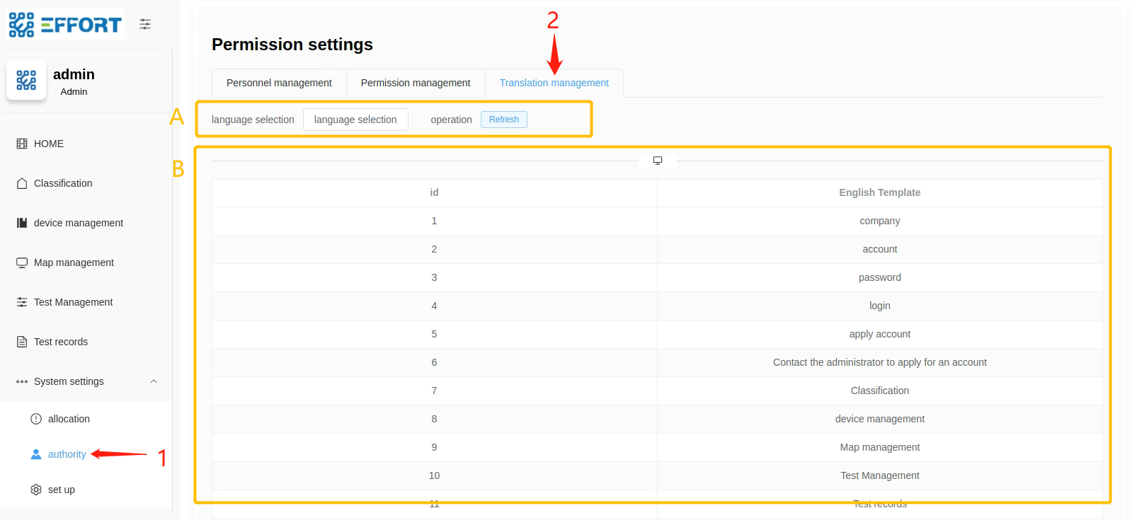 - 方框 A:语言管理的操作栏:语言选择按钮、刷新按钮
