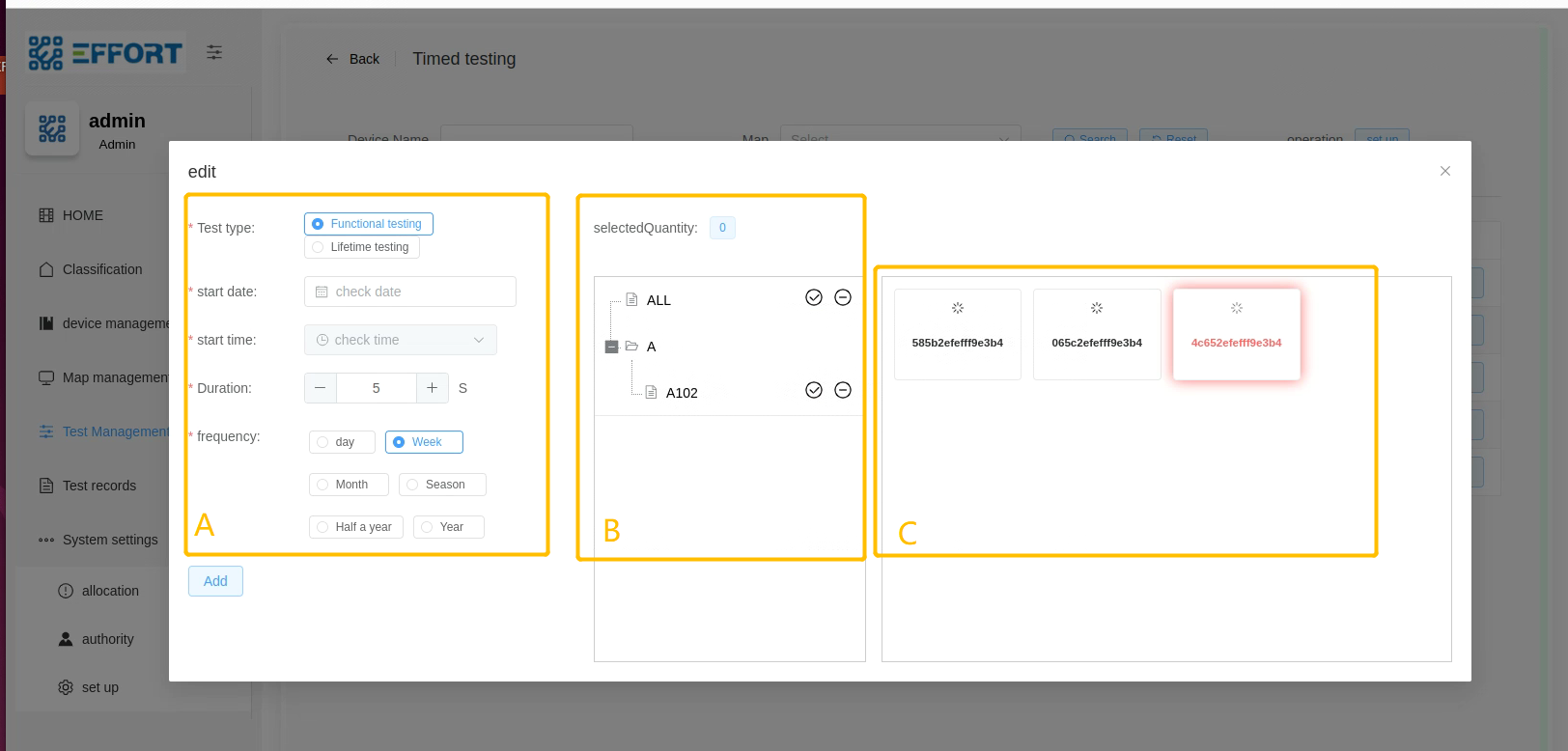 - 方框 A:设备详情信息:设备名字、设备状态、工作详情、所在区域