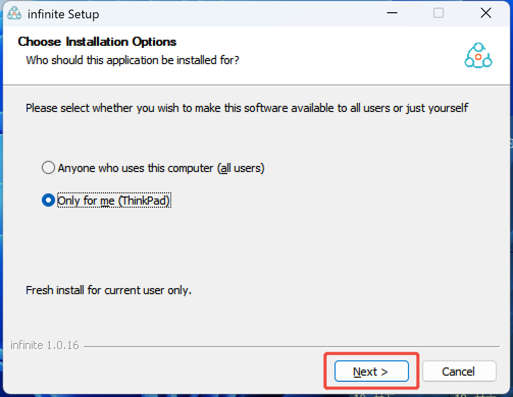 ▶️ 步骤 1:启动安装向导 双击 infinite-win-1.0.19-x64.exe