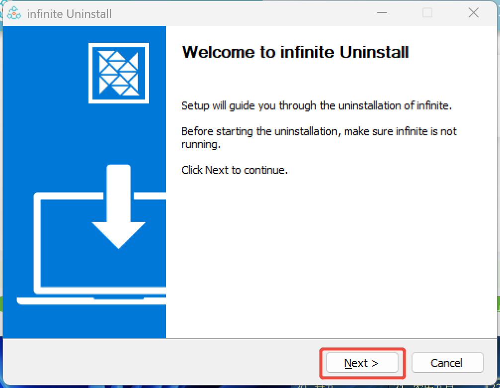 ⚠️ 注意:当前进度已完全卸载,双击点击安装向导 infinite-win-1.0.16-x64.exe 可再次安装