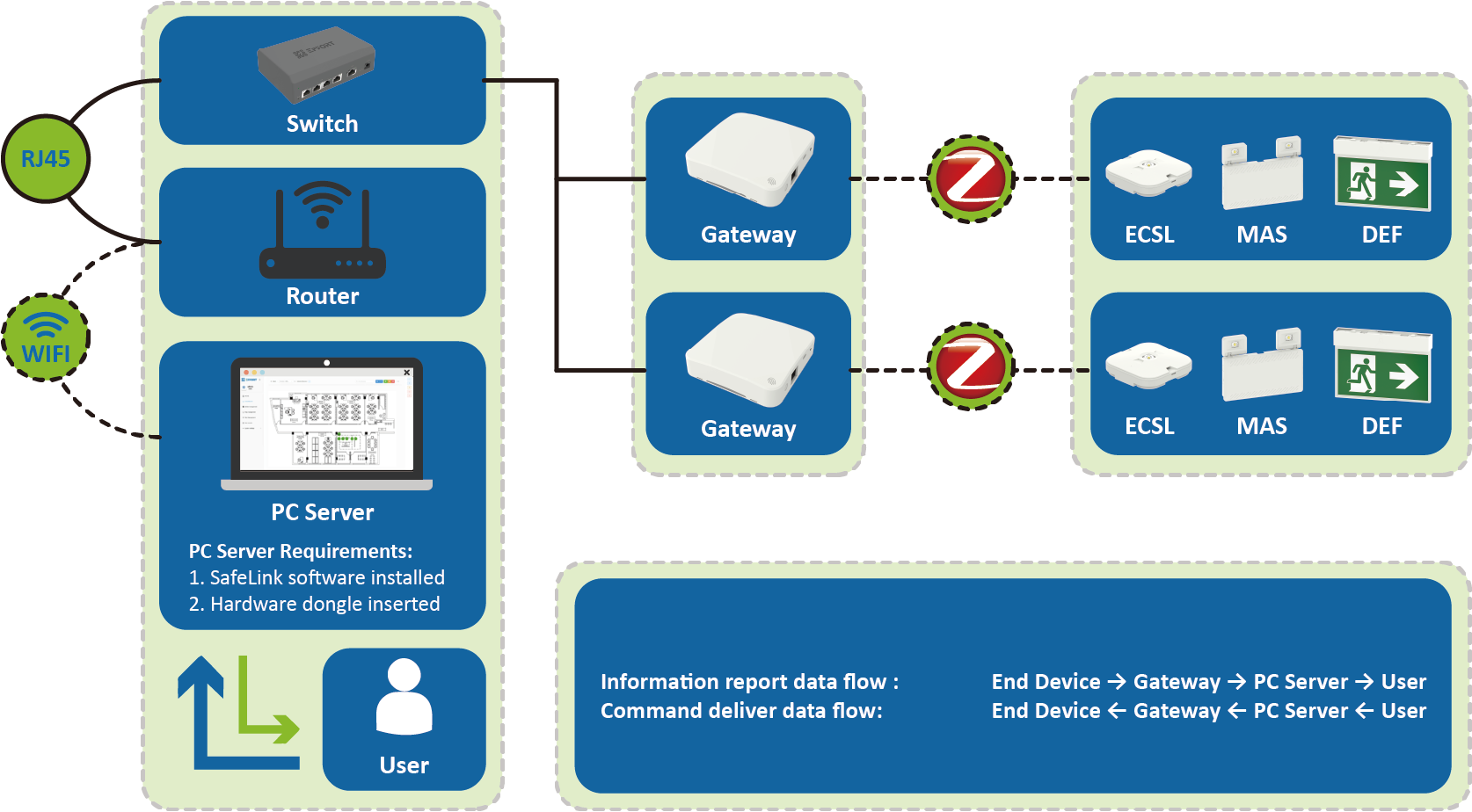 - 采用 ZigBee 无线 Mesh 组网技术,实现在高间距部署下的稳定实时通讯,更加契合应急照明领域